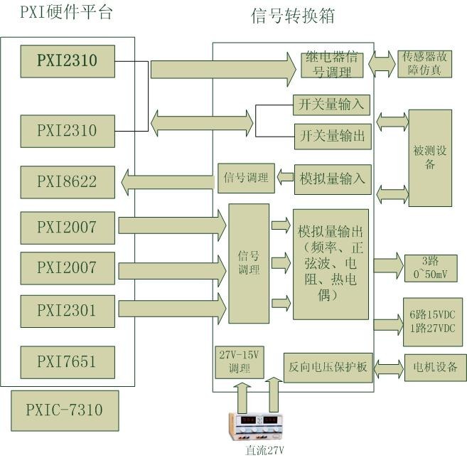本系統(tǒng)分為PXI硬件平臺、信號轉(zhuǎn)換箱兩部分,二者之間通過電纜連接。由PXI硬件平臺構(gòu)建設(shè)備所需的硬件資源,包括PXI機(jī)箱、PXI系統(tǒng)控制器、數(shù)據(jù)采集采集模塊、開關(guān)量輸入輸出模塊、模擬量輸出模塊、傳感器故障仿真信號(繼電器模塊)、程控75.96~195.56Ω電阻信號輸出模塊等。信號轉(zhuǎn)換箱提供與被測設(shè)備相連的測試接口,根據(jù)被測設(shè)備的使用要求進(jìn)行自定義設(shè)計(jì)。同時(shí)信號轉(zhuǎn)換箱實(shí)現(xiàn)對電源轉(zhuǎn)換、輸入/輸出信號的調(diào)理。系統(tǒng)結(jié)構(gòu)圖如下所示:
