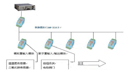 基礎(chǔ)設(shè)備支持±10V,±5V,0~10V,0~5V,0~20mA,4~20mA的傳感信號和控制信號接口。采用了DAM-3055模擬量輸入模塊收集溫濕度等模擬傳感器信號,對開關(guān)信號和控制則用了DAM-3028D數(shù)字量輸入輸出模塊。