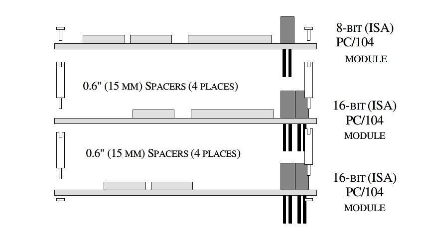 2、堆棧式連接:去掉總線背板和插板滑道,總線以“針”和“孔”形式層疊連接,即PC104總線模塊之間總線的連接是通過上層的針和下層的孔相互咬和相連,這種層疊封裝有極好的抗震性。