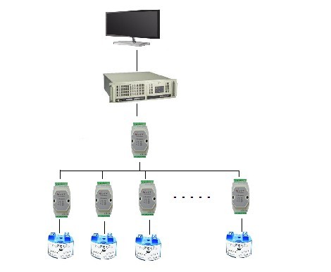 中間的PC通過DAM-3210,隔離RS-232轉(zhuǎn)RS-485模塊輸入連接到MODBUS上。