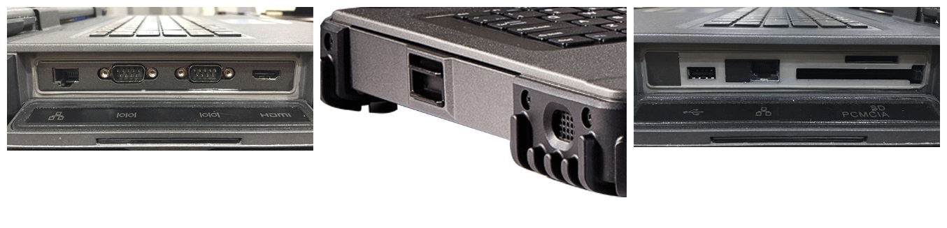 在三防加固筆記本的機(jī)身左右兩則,共擁有兩個保護(hù)蓋,左側(cè)的保護(hù)蓋內(nèi)擁有RJ45接口、串行D-sub9針(x2)接口、HDMI接口;右側(cè)的保護(hù)蓋內(nèi)有USB接口、RJ45接口、SD記憶卡插槽,擴(kuò)展艙(可以根據(jù)客戶需求定制擴(kuò)展接口)。