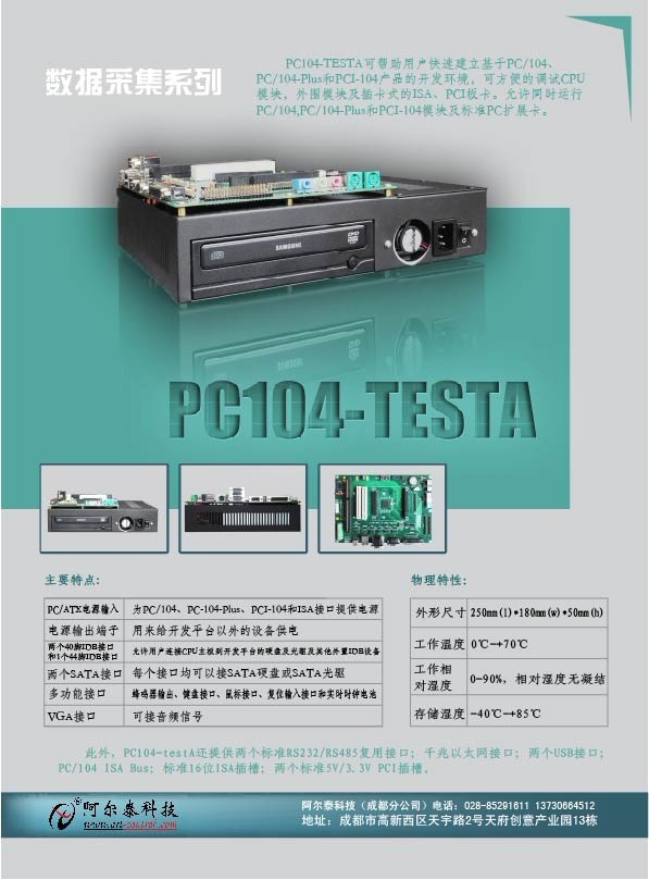 新品推介—PC104-testA背板一、背板簡介 PC104-TESTA背板可幫助用戶快速建立基于PC/104、PC/104-Plus和PCI-104產(chǎn)品的開發(fā)環(huán)境,可方便的調(diào)試CPU模塊,外圍模塊及插卡式的ISA、PCI板卡。允許同時(shí)運(yùn)行PC/104,PC/104-Plus和PCI-104模塊及標(biāo)準(zhǔn)PC擴(kuò)展卡。二、主要特點(diǎn)標(biāo)準(zhǔn)PC/ATX電源接口★多種標(biāo)準(zhǔn)PC接口
